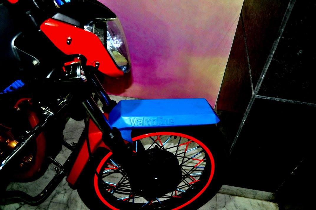 A corporate concept bike for the brand Valvoline. The Motorcycle is full of the brand color, theme and logo. The unique creation that one can definitely identify is the tank. As you can see the whole tank is replicated on the product the brand wanted to focus. The fenders have taken cues from the shape of the packing on the original bottle. The headlight have been meticulously selected to match the "V" form in the logo. Overall its a feast for the brand when one enters the corporate office in Gurgaon..